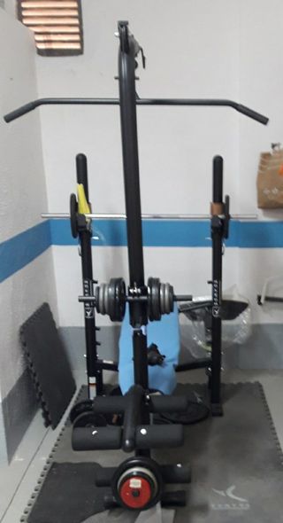 Equipo de gimnasio completo para entrenar en casa. Disponible para venta: - Rack de musculación plegable con barra olimpica negra (20 kg, 220 cm). - Banco de entrenamiento configurable. - Discos de 20, 10 y 5 kg (pares). Todo valorado en más de 750 €. Preguntar por los precios de los artículos por separado. Se pueden solicitar más fotos. No se envía, pero preguntar por la posibilidad de quedar en persona.