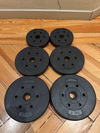Conjunto de discos para pesas de gimnasio, perfectos para complementar tu entrenamiento. - Dos discos de 2.5 kg. - Dos discos de 2 kg. - Dos discos de 1.25 kg.