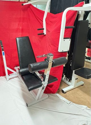 Banco de pesas para press de banca con asiento y respaldo acolchados. - Estructura metálica blanca. - Asiento y respaldo en polipiel negra. - Rodillos para piernas. - Ajustable en altura.