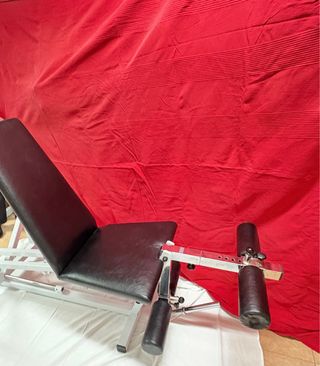 Banco de pesas con estructura negra y detalles rojos. Incluye rodillos para ejercicios. - Tapicería acolchada en negro y rojo. - Soporte para piernas. - Diseño robusto.