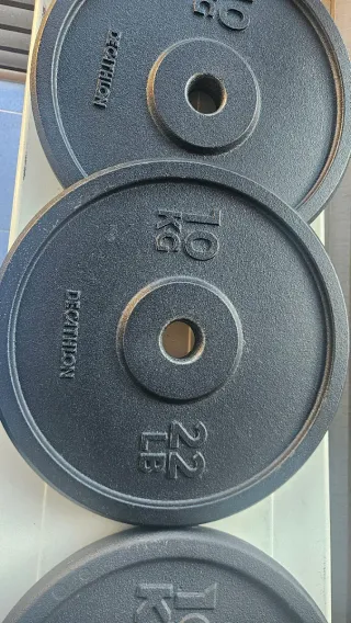 Se venden dos discos de pesas de 10 kg cada uno, nuevos a estrenar. - Peso: 10 kg por disco. - Diámetro del eje: 2,5 cms - Color: Negro. Son demasiado grandes para mí.