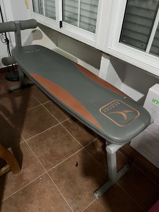 Equipo de gimnasio para entrenar en casa. Marcas evidentes de uso , pero totalmente funcional , espumas y forros de las colchonetas intactos - Máquina de musculación multifuncional. - Banco articulado con diferentes posiciones. - Incluye 50 kg en discos de peso.