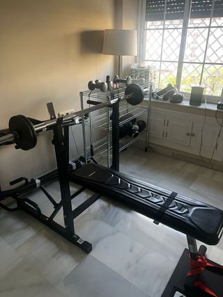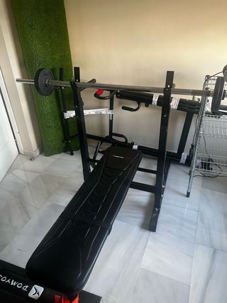 Vendo press de banca space saver en estado impecable, prácticamente nuevo. Incluye barra metálica, pesas 15kg aprox y soporte estable ideal para entrenamientos de fuerza en casa: pecho, hombros y brazos. Estructuras sólida, regulable en inclinación y altura, muy cómoda y segura. Solo se ha usado un par de veces y está en perfectas condiciones. 🚫No hago envios- Solo entrega en mano (Sevilla). ◻️Motivo de venta: Falta de espacio. 🏋️♂️Perfecto para quien quiera montar su gimnasio con material de calidad. ✅ Estado: 9.5/10. ⚙️Marca: Space Saver. 💪Muy robusto y cómodo.