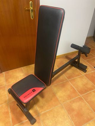 Banco musculación + juego mancuernas Domyos — 150 € Vendo conjunto completo de banco de pesas con rack y kit de mancuernas Domyos/Corength. Todo en buen estado y funcionando perfectamente. Incluye: Banco multiposición regulable con rack para barra Columna con elásticos de resistencia (incluidos) Rodillos para press de pierna/curl femoral Sistema de ajuste de inclinación Kit mancuernas Domyos en maletín: 2 barras + discos (4 × 1 kg y 4 × 1,5 kg) con cierres de estrella Estado: Buen uso general. El respaldo trasero tiene un pequeño desperfecto en la tela (visible en fotos). Precio: 150 € — todo junto, no separo Recogida en mano. Sin e
