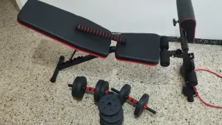 Equipo de gimnasio para entrenar en casa. - Banco de pesas con acolchado. - Mancuernas ajustables con discos.(20kg) - accesorio para convertir las mancuernas en barra