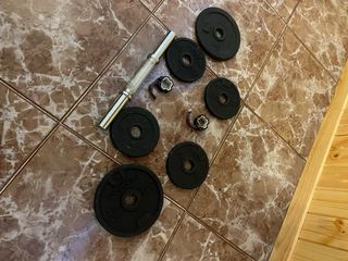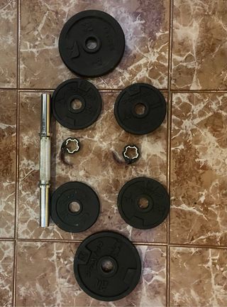 Kit de mancuernas para entrenamiento de fuerza. Barra de pesas: 1 larga de 14kg. 2 cortas de 1.5kg Discos de diferentes pesos: 2 de 5kg. 8 de 2kg. 4 de 1kg Cierres de seguridad para la barra: 6 cierres. Soporte para flexiones. Se pueden vender las piezas por separado. No hay indicios de desgaste ni imperfecciones. El descuento frente al precio original es del 35%.