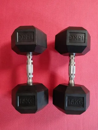 Par de mancuernas hexagonales de 15 kg cada una, recubiertas de caucho. - Diseño hexagonal para evitar que rueden. - Empuñadura texturizada para un mejor agarre. - Peso: 15 kg por mancuerna. Usadas muy pocas veces. No puedo hacer envíos, porque el peso superaría el máximo permitido por Wallapop. 75€ las 2 pesas, dinero en efectivo y la cantidad justa. No bajo más de precio.