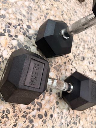 Par de mancuernas hexagonales de 12,5 kg cada una. Ideales para entrenamientos de fuerza y tonificación. - Diseño hexagonal que evita que rueden. - Cubiertas de Goma para evitar ruido al dejarlas en el suelo. - Empuñadura metálica texturizada para un agarre seguro. -En excelente estado. Como Nuevas. Entrega en mano en Martorell (tengo más Mancuernas y Pesas desde 10 hasta 22,5 kg / barra olímpica/ Discos 25/20/15/10/5/2,5 kg en venta + Kettleball 8 y 12 kg)