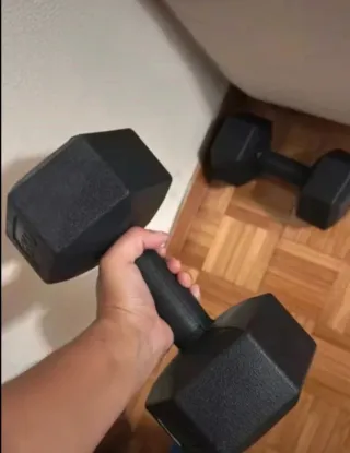 Vendo juego de pesas/mancuernas en perfecto estado, ideales para entrenamiento en casa. Incluye: 🟦 Par de mancuernas de 5 kg (10 kg en total) ⬜ Par de mancuernas de 4 kg (8 kg en total) ✔️ Revestimiento de neopreno, cómodo al agarre y protege el suelo ✔️ Diseño hexagonal, no ruedan ✔️ Poco uso, muy bien cuidadas ✔️ Perfectas para fuerza, tonificación, cross training o rehabilitación Se venden juntas