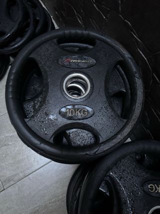 Discos olímpicos de 10 kg para equipar tu gimnasio. 2.5€/Kg Hasta 20 unidades - Peso: 10 kg por disco. - Material: Hierro fundido con recubrimiento. - Diseño: Agujeros para facilitar el agarre.