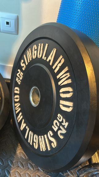 Dos discos de pesas de la marca Singularwod, precio por unidad. - Eje de 50mm apto para todas las barras olímpicas. - Peso: 25 kg por disco. - Marca: Singularwod. - Material: Goma/Acero.