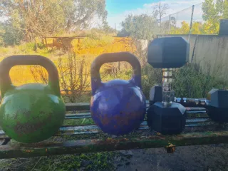 Equipo de gimnasio para entrenar en casa. - Barra de pesas con agarre acolchado. - Mancuernas con discos. - Mancuernas rusas (kettlebells). - 6 discos de 5 kgs y 6 de 2,5 kgs.