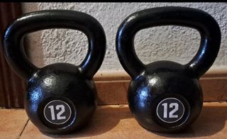 Vendo pareja de kettlebells marca Domyos, en buen estado, 20kgs cada una. Material hierro fundido, con base de goma. - precio unitario 55 eur - precio pareja 95 eur No negociable Ligero desgaste, aunque todo ok. No se hacen envíos, A recoger en Náquera, Burjassot o cercanías (Valencia).