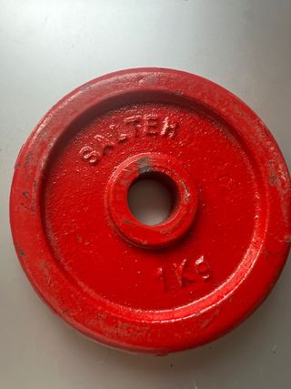 2 Discos de pesa de la marca Salter, con un peso de 1kg. Ideal para complementar tu equipamiento de gimnasio. - Color rojo. - Material de hierro fundido.
