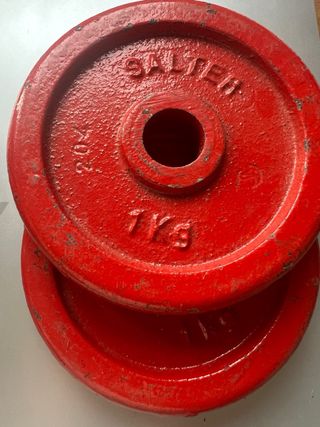 Dos discos de pesa Salter de 1kg cada uno, en color rojo. - Marca: Salter - Peso: 1kg por disco - Color: Rojo