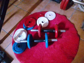 Conjunto de pesas y discos para entrenamiento en casa. Todo lo que se ve en la foto. Hago envios - Dos mancuernas con discos. - Discos de 2.5 kg marca Trojan (2 unidades). - Discos de 1 kg marca Salter (1 unidad). - Disco rojo sin marca visible.