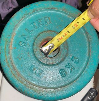 Disfruta de estas pesas de la marca Salter, ideales para tu entrenamiento. Son dos pesas de 4kg cada una. Se encuentran en buen estado, aunque muestran señales normales de uso. - Marca: Salter - Peso: 4kg cada una - Cantidad: 2 unidades