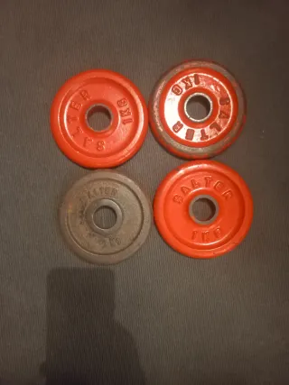 Se venden 8 discos de pesa de la marca Salter, cada uno con un peso de 1kg. Son ideales para complementar tu equipamiento de gimnasio en casa. - Marca: Salter - Peso por disco: 1kg - Cantidad: 8 unidades - Regalo: pack de 2 abrazaderas Se venden también por separado, precio: 15€.