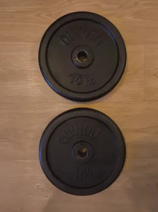 Se venden dos discos de pesas de la marca QUINDO. Para barras tipo SALTER de 30mm. - Cada disco pesa 15 kg. - Color negro. - Diámetro 30mm. - Hierro fundido.