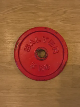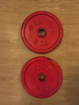 Se venden dos discos de pesas de la marca SALTER, cada uno con un peso de 5 kg. Para barras de 30mm. - Marca: SALTER - Peso por disco: 5 kg - Color: Rojo - Diámetro: 30mm. - Hierro fundido.