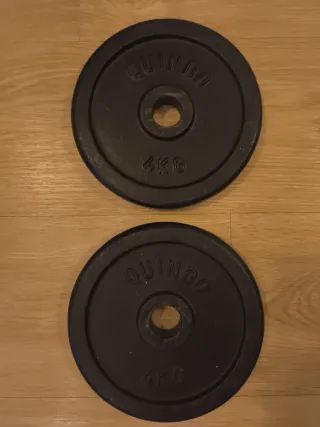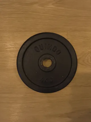 Se venden dos discos de pesas de la marca QUINDO. Para barras tipo SALTER de 30mm. - Cada disco pesa 4 kg. - Color negro. - Diámetro 30mm. - Hierro fundido.
