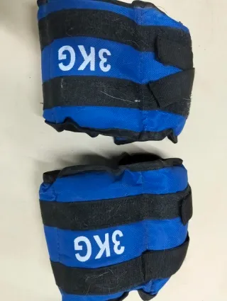 Par de pesas para tobillos o muñecas - Color azul con rayas negras. - Cierre de velcro ajustable. - Ideales para entrenamiento. De regalo par de pesas para tobillos. El peso total de las 4 pesas -3 kg. A pesar de lo que pone en las pesas azules