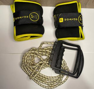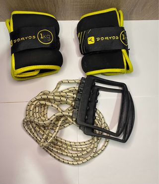Set de pesas para tobillos y muñecas Domyos de 1kg cada una, junto con una cuerda de ejercicio que se estira con dos agarres para entrenar. Estan como nuevos, acepto intercambio y ofertas.Cualquier pregunta no dude en hablarme.Gracias - Pesas Domyos con cierre de velcro. - Color negro con detalles en amarillo. - Cada pesa es de 1kg. - Cuerda de ejercicio con asas negras.