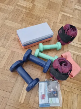 Conjunto de accesorios para entrenamiento en casa. - Dos mancuernas azules. - Dos mancuernas verdes. - Un bloque de yoga de tres colores. - Dos tobilleras de peso (1kg cada una). - Una banda elástica rosa. - Instrucciones de uso.
