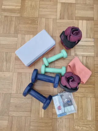 Conjunto de accesorios para entrenar en casa. - Rueda abdominal de la marca Domyos con asas ergonómicas. - Banda elástica de pilates de la marca Decathlon. - Banda elástica para entrenamiento de fuerza y resistencia de la marca Decathlon. - Dos pesas tobilleras/muñequeras de 3 kg cada una de la marca Bodytone. El cierre ajustable de velcro está como se ve en las fotos, si se quiere es fácil cambiarlo.
