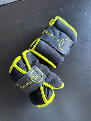 Par de tobilleras o muñequeras con peso de 1kg cada una. Perfectas para complementar tu entrenamiento. - Color negro con detalles en amarillo. - Cierre de velcro ajustable. - Marca Domyos.