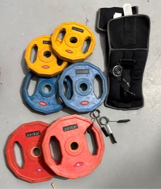 Lote de pesas con barra larga y tobilleras para entrenamiento. - Pesas de diferentes colores: amarillas, azules y rojas. 60€ - Tobilleras de 2 kg cada una. 15€ las dos