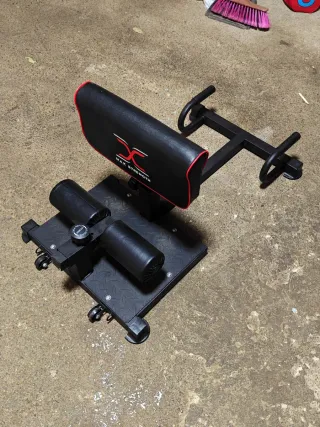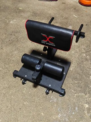 Máquina para ejercicios de sentadilla tipo sissy squat y flexiones. Lleva ruedas para transportar fácilmente y configurable en altura. Pesa muy poco, ideal para trabajar pierna específicamente. Muy buen estado - Estructura robusta de color negro. - Acolchado para soporte. - Diseño con logo Max Strength.