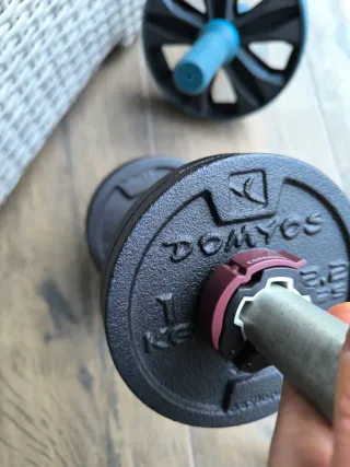 Juego de pesas de la marca DOMYOS. - Disco de 1 kg. - Cierre de seguridad para barra.