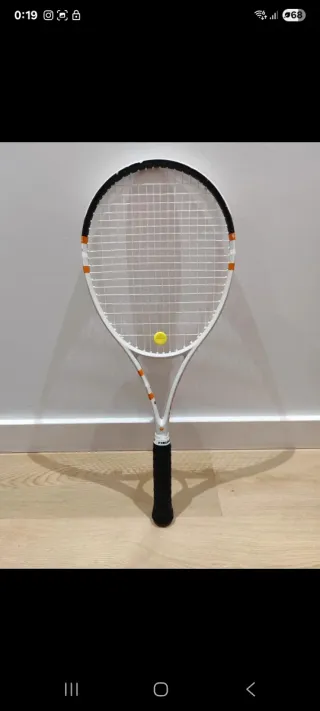 Raqueta de tenis Wilson Triumph Roland Garros en buen estado. - Diseño blanco con detalles naranjas y azules. - Empuñadura talla 3, overgrip nuevo. - Cordaje Head Velocity MLT 16g nuevo. - Peso 298gr - Signos de uso, los visibles en las fotos.