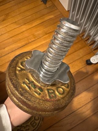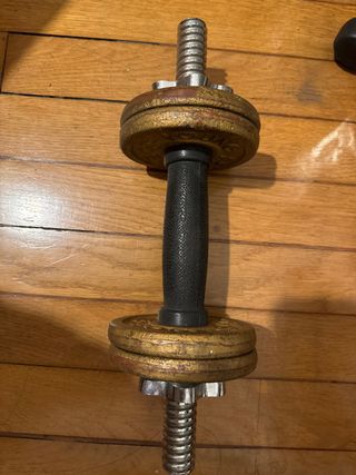 Mancuerna vintage con discos de peso ajustables. Ideal para entrenamientos en casa. - Mango texturizado para un agarre firme. - Discos de peso dorados con detalles en rojo. - Cierre de rosca para asegurar los discos.