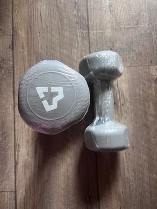 Par de pesas pequeñas, ideales para ejercicios en casa o para llevar de viaje. Cada pesa tiene un diseño cilíndrico con extremos acolchados para un agarre cómodo. Si el envío es por correos tengo que cambiar el peso del paquete - Color del acolchado: negro. - Color del cuerpo central: gris.