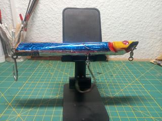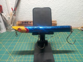 Señuelo de pesca artesanal, echo desde cero por un aficionado (de hay el resultado poco refinado) para un spinning pesado desde embarcación para grandes depredadores Está cubierto por completo por resina epoxi, la idea fue hacer un paseante de superficie que salpique agua y no ha sido probado Una pieza totalmente Única - Diseño llamativo y colorido. - Dos anzuelos incluidos. - Acabado brillante y atractivo.