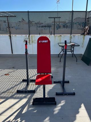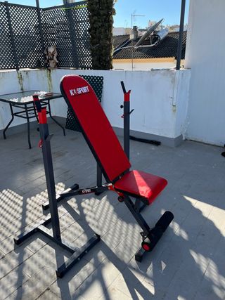 Banco de entrenamiento K-Sport con soporte para barras. Ideal para rutinas de fuerza en casa. - Banco acolchado en rojo y negro. - Estructura metálica resistente. - Soporte para barra integrado. NEGOCIABLE!!!
