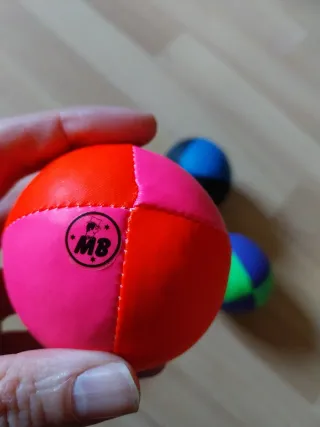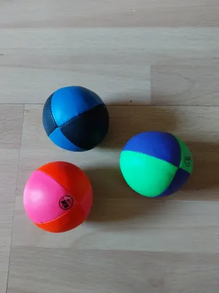 Set de tres bolas de malabares, de la marca suiza de malabares Mister Babache, con interior de semillas. - Diámetro: 63mm. - Peso: 103g. Están nuevas (aún tienen la pegatina de la marca) porque nunca las llegué a usar.