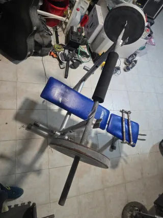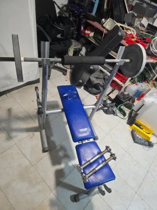 Banco de pesas HOBBY WB3000 con barra y mancuernas. - Estructura metálica. - Asiento y respaldo acolchados en color azul. - Incluye barra con discos de unos 15 kilos cada una y dos mancuernas.