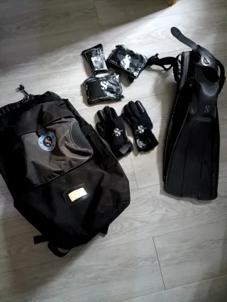 Mochila de buceo Scubapro que incluye: - Mochila de buceo Scubapro. - Aletas de buceo Scubapro. - Guantes de buceo Scubapro talla S/M - Pesos de buceo Scubapro (3 unidades).