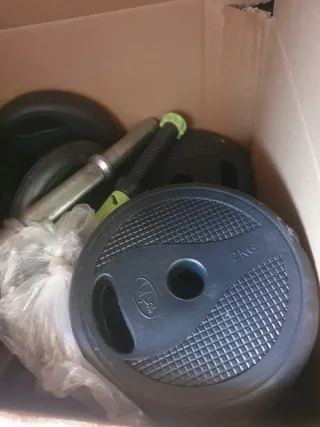 Pack de pesas y barras para entrenamiento en casa o gimnasio. - Incluye: •8 pesas de 2kg •8 pesas de 1kg •2 barras de 38cm de largo y 28mm diámetro con sus 4 bloqueadores •2 barras roscadas de 35cm de largo y 28mm diámetro con sus 4 bloqueadores roscados • 1 barras Z de 1,20m de largo y 28mm diámetro - Toda las pesas son compatibles con todas las barras