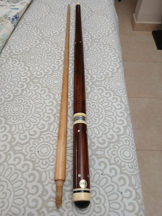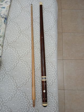 Taco de billar profesional de madera con incrustaciones en nacar. Tiene una longitud de 1,42m y un peso de 520 gramos. Desconozco tipo de madera y marca, es una herencia y no se mucho de billar. Mejor verlo.