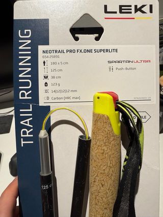 Bastones Leki Neotrail Pro FX.One Superlite para trail running. - Longitud: 125 cm. - Material: Carbono (HRC max). - Sistema de cierre: Push-Button. - Diámetro: 14|12|12|12 mm. - Peso: 123 g. Se han usado dos veces. Se venden los dos, pero uno de los bastones tiene un tramo roto.