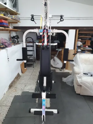 Máquina de pesas multifunción para entrenar en casa. - Estructura robusta de acero. - Asiento acolchado. - Poleas y cables para diversos ejercicios. - Torre de pesas incluida.