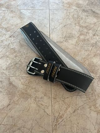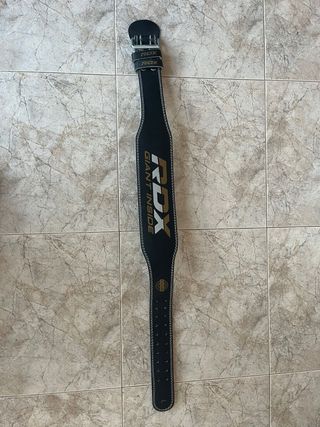 Cinturón de levantamiento de peso de la marca RDX, ideal para soporte lumbar. - Color negro con detalles dorados y blancos. - Cierre de hebilla doble. - Talla L.