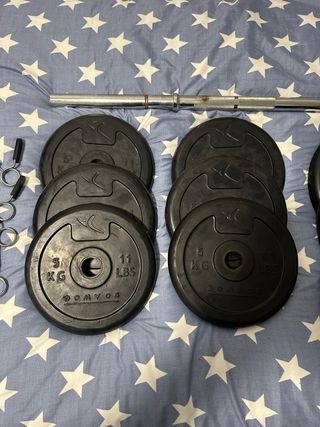 Juego de pesas en buen estado. No se vende por separado. Incluye: - Barra de 120cm. - 2 barras de 35cm. - 4 discos de 10kg. - 6 discos de 5kg. - 4 cierres para barra.