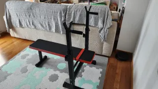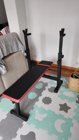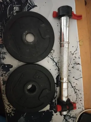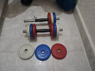 Equipo de gimnasio para entrenar en casa. - Banco de pesas. - Barra. - Mancuernas. - Discos de pesas. 8 discos de 5kg 4 discos de 2.5kg 4 discos de 1.25kg 3 discos de 1kg