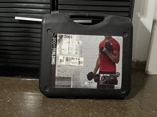 Kit de pesas para entrenamiento de bodybuilding con un peso total de 20 kg, presentado en un práctico maletín. - Maletín de transporte. - Diseño para bodybuilding.