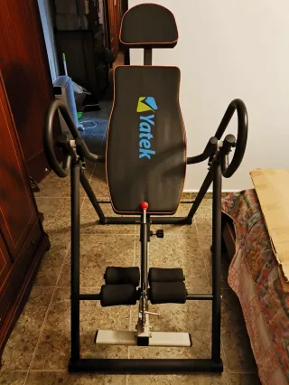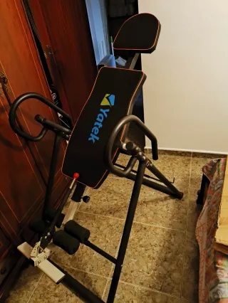 Tabla de inversión Yatek ECO plegable, con inversión total de 180°, soporta hasta 150kg de peso, graduable en altura desde 1,30 mts hasta 2 mts. Está completa con todos sus pasadores, tiene 2 pequeños defectos, en la base se ha saltado un poco la pintura, y la tela embellecedora trasera está un poco suelta, todo eso no afecta en nada a su funcionamiento (ver fotos) por lo demás la tabla está perfecta y completa. Funciona perfectamente, la vendo por espacio, está a menos de la mitad de precio del sitio más barato que he encontrado.